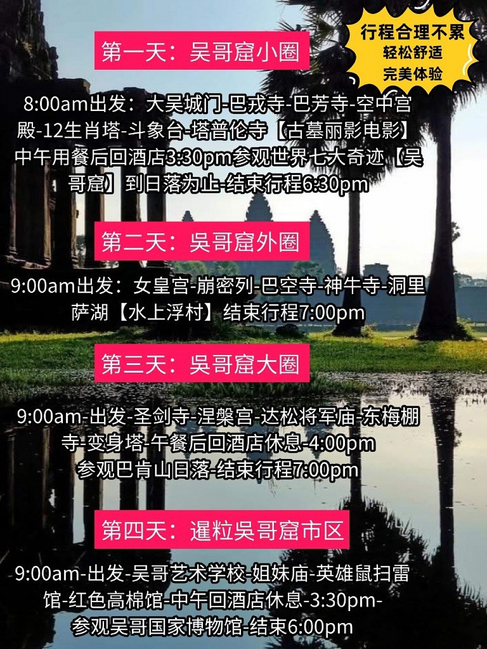 我们提供三天常规行程和四天深度行程,覆盖小圈、大圈、外圈及暹粒市区,适合中老年、青少年和亲子家庭。避开高温,行程轻松舒适,专业司机安全接送,持证专业导游讲解,纯玩无购物,放心出游!